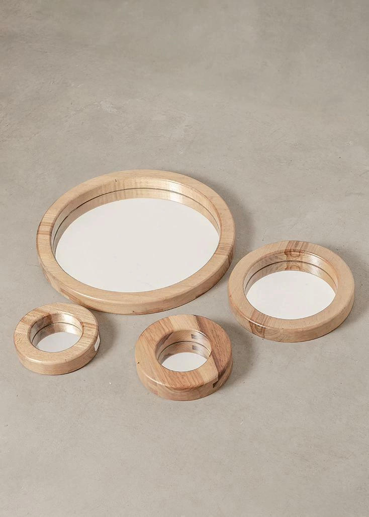 Cuenta con un espejo de 4 mm de espesor y un marco redondo de madera maciza de Petiribí.